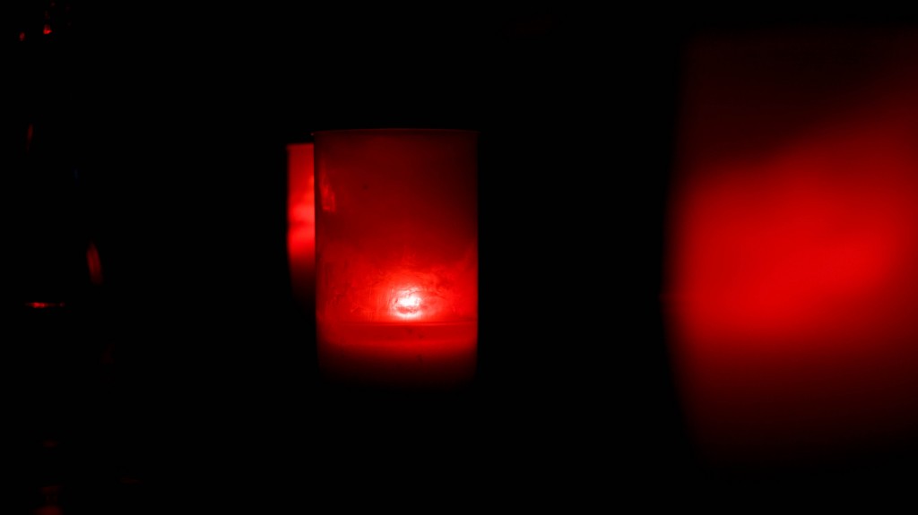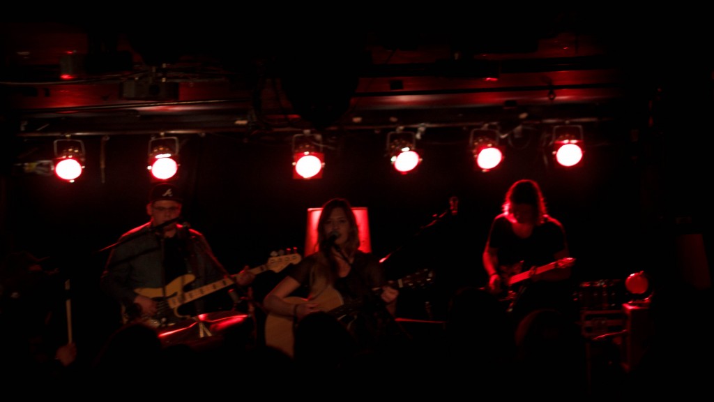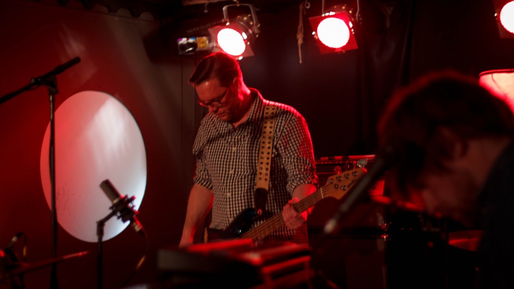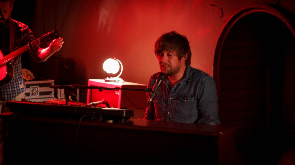 Nach kurzer Wartezeit wurden die Türen geöffnet und wir konnten den komplett in schwarz gestrichenen Raum betreten. Die Bühne wurde in rotes Licht gehüllt und war mit Klavier, Schlagzeug und mehreren Gitarren bestückt.