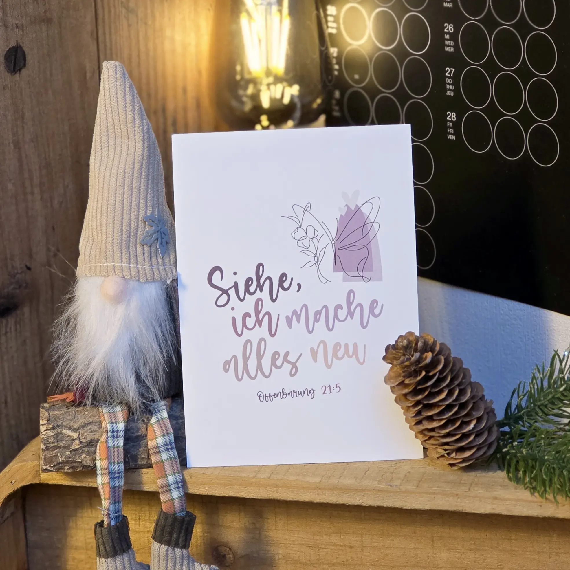 Mit diesen fünf hochwertigen Postkarten zur Jahreslosung 2026 bringst du Gottes kraftvolle Zusage „Siehe, ich mache alles neu“ (Offenbarung 21:5) direkt in deinen Alltag – oder in das Leben deiner Lieben. Das minimalistische Design mit handschriftlicher Typografie und dem zarten Schmetterlingsmotiv verbindet moderne Ästhetik mit einer tiefen geistlichen Botschaft: Gott schenkt Neuanfang, Hoffnung und Verwandlung. Ob als kleine Ermutigung für Freunde, als Deko für deinen Schreibtisch oder als klares Statement für unterwegs – diese Karten erinnern dich täglich daran, dass Er alles neu macht.