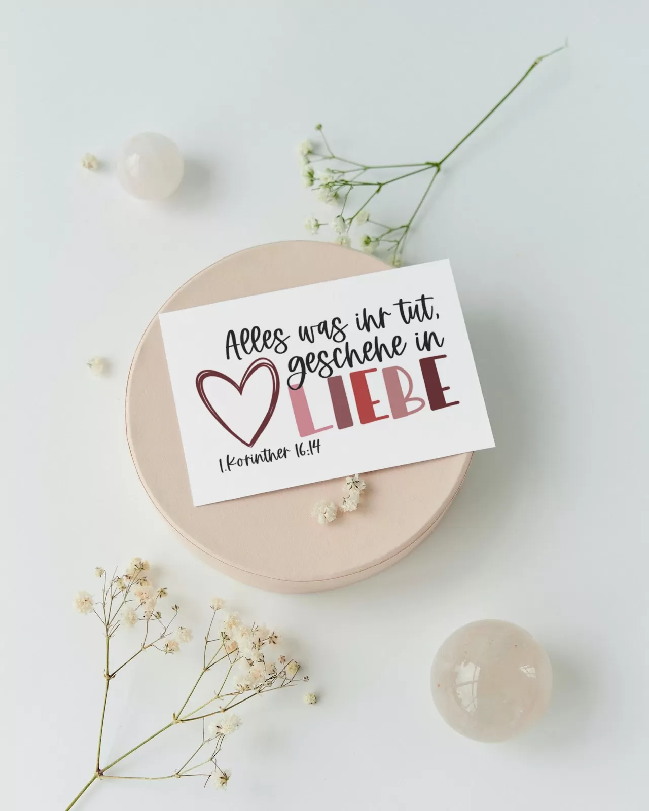 Der Bibelvers 1. Korinther 16, 14 inspiriert uns dazu, unser Leben auf Gottes Wort auszurichten und uns an seine Führung zu halten. Diese Postkarte eignet sich hervorragend als Inspiration für dich und deine Freunde.