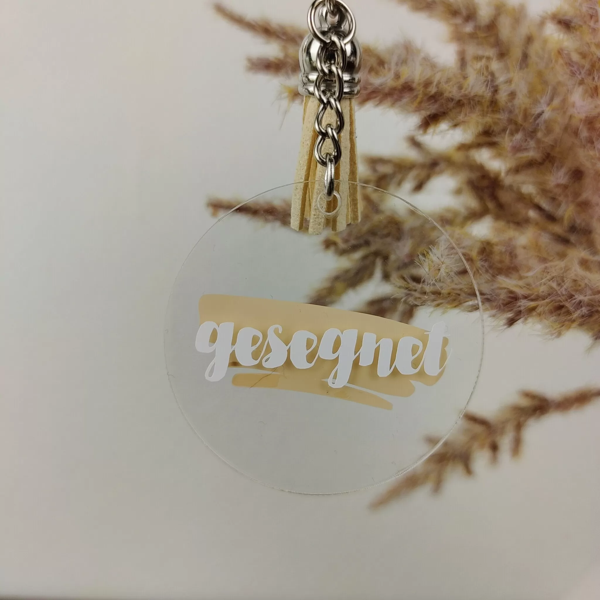 Schlüsselanhänger aus Handarbeit. Text und Grafik aus widerstandsfähigem Vinyl geschnitten.