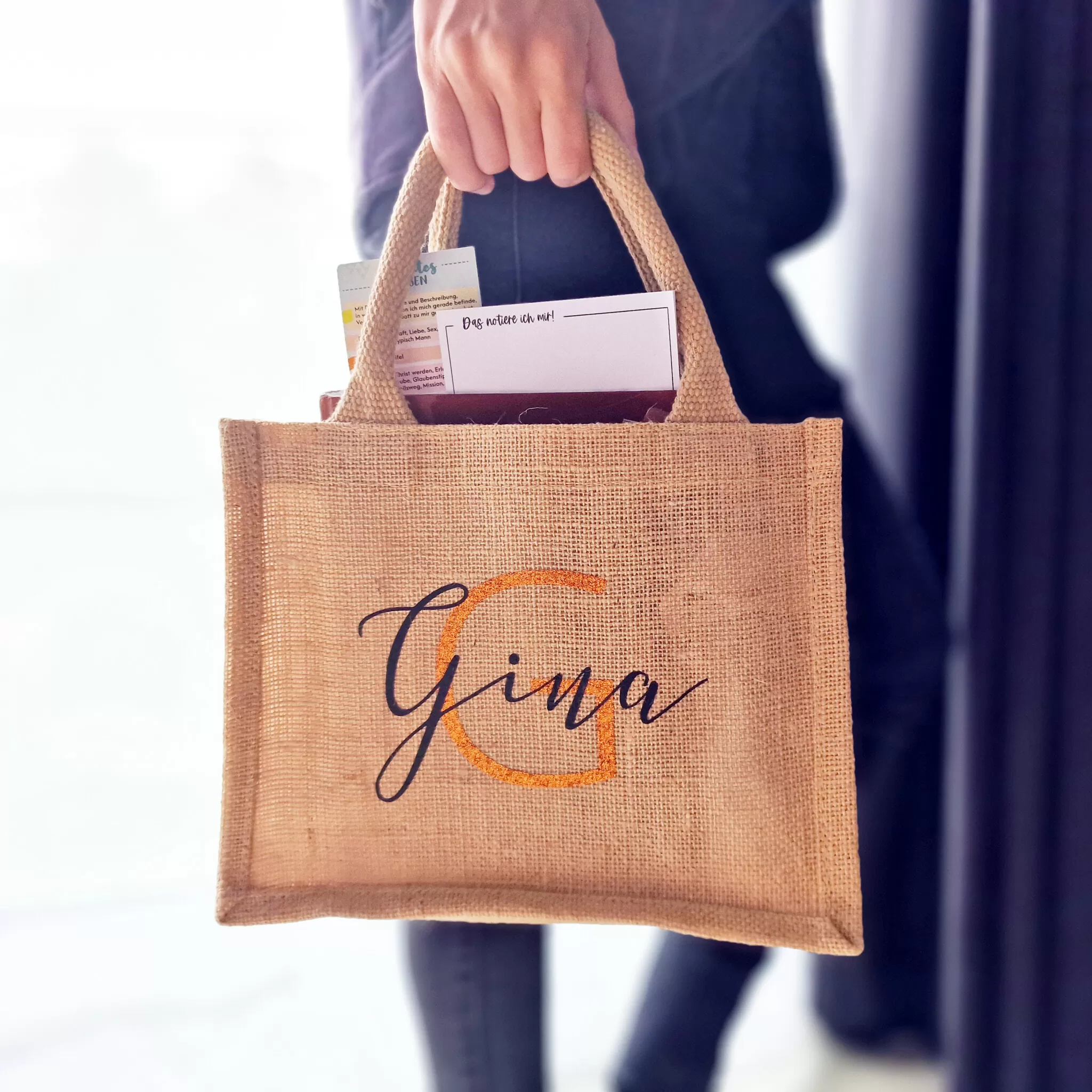 Stilvoll, persönlich und funktional – unsere Jute-Tasche ist mehr als nur ein Beutel. Hol dir jetzt deine personalisierte Jute-Tasche und trage deine Bibel und deine Gedanken mit Freude bei dir.
