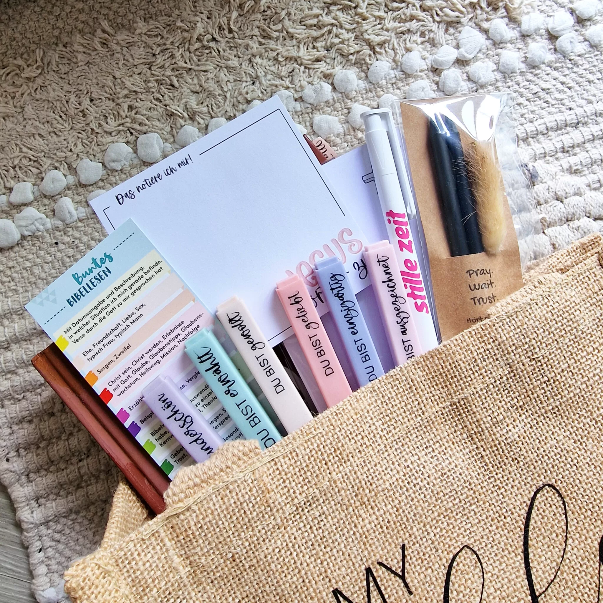 Bist du auch genervt deine Sachen fürs Bibelstudium immer zu suchen? Unsere Jute-Tasche ist mehr als nur ein Accessoire – sie ist dein Begleiter auf dem Weg deines Glaubens! Sie wird dir dabei helfen, deine Bibel, Buntstifte und Notizbücher stilvoll und praktisch aufzubewahren und zu transportieren.