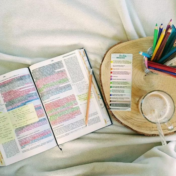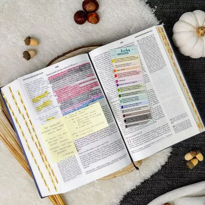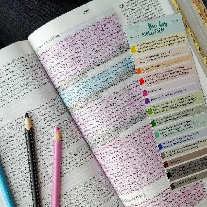 Es funktioniert eigentlich ganz einfach. Alles was du brauchst, sind Buntstifte und die Lust daran, dich mit deiner Bibel auseinanderzusetzen. Jede Farbe bekommt Kategorien und dann fängt man eigentlich schon an zu lesen.