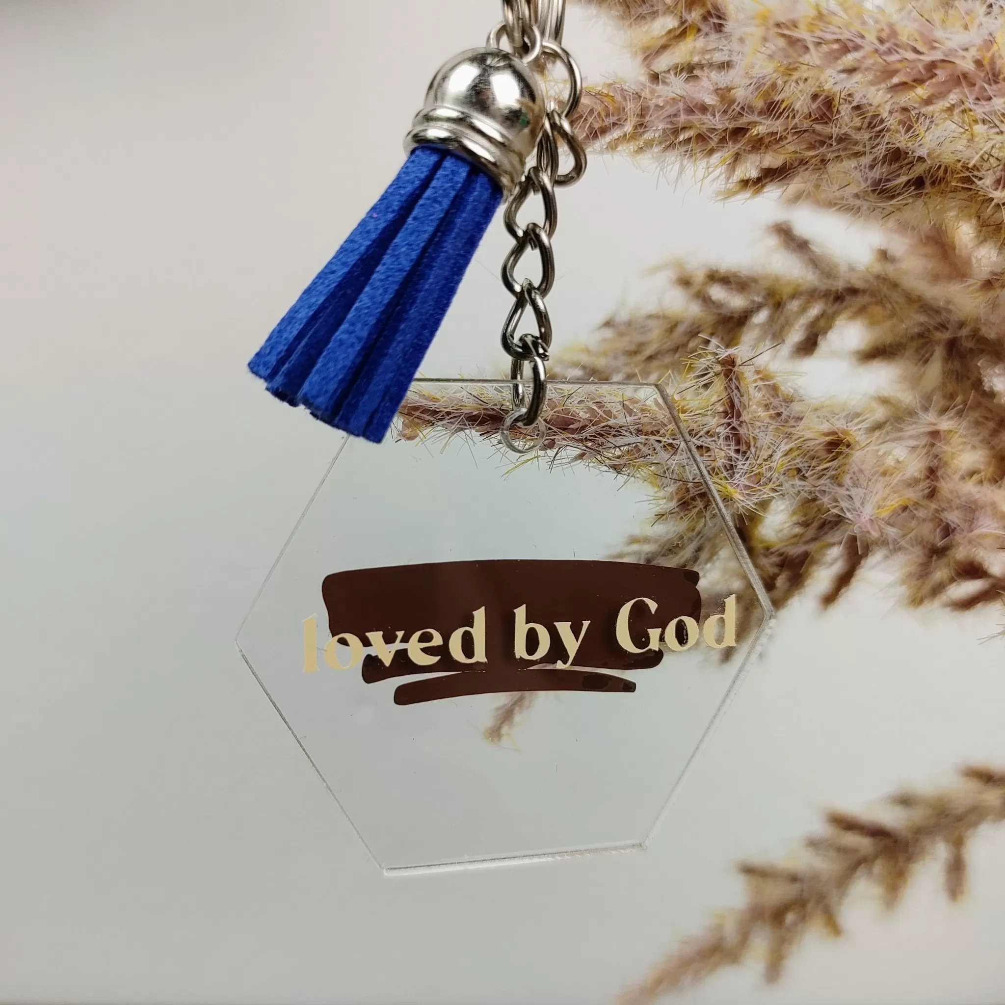 Schlüsselanhänger aus Handarbeit. Text und Grafik aus widerstandsfähigem Vinyl geschnitten.