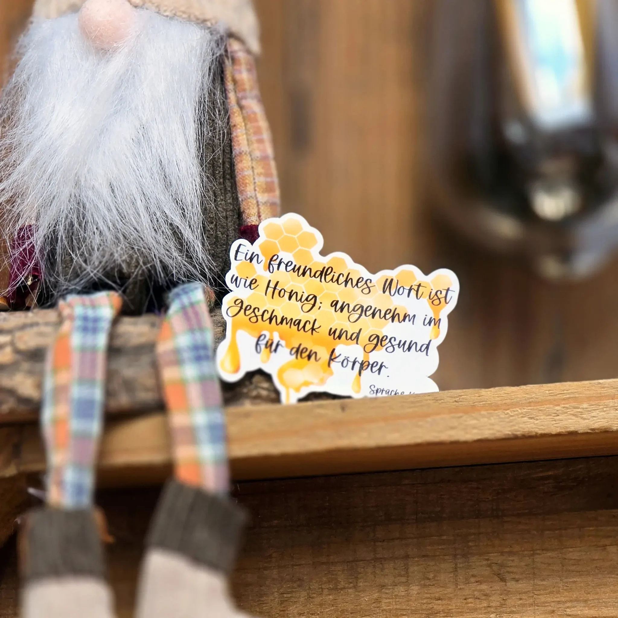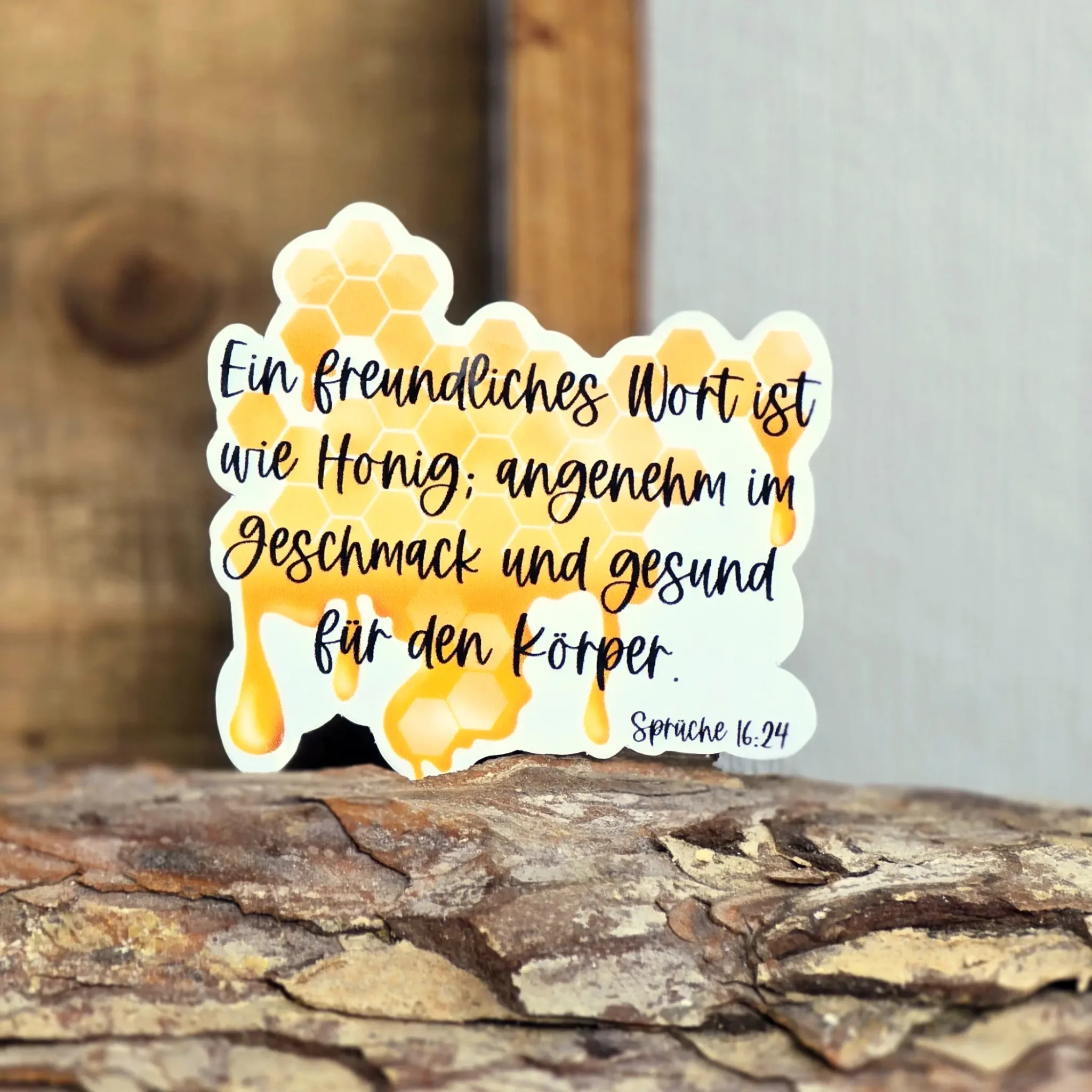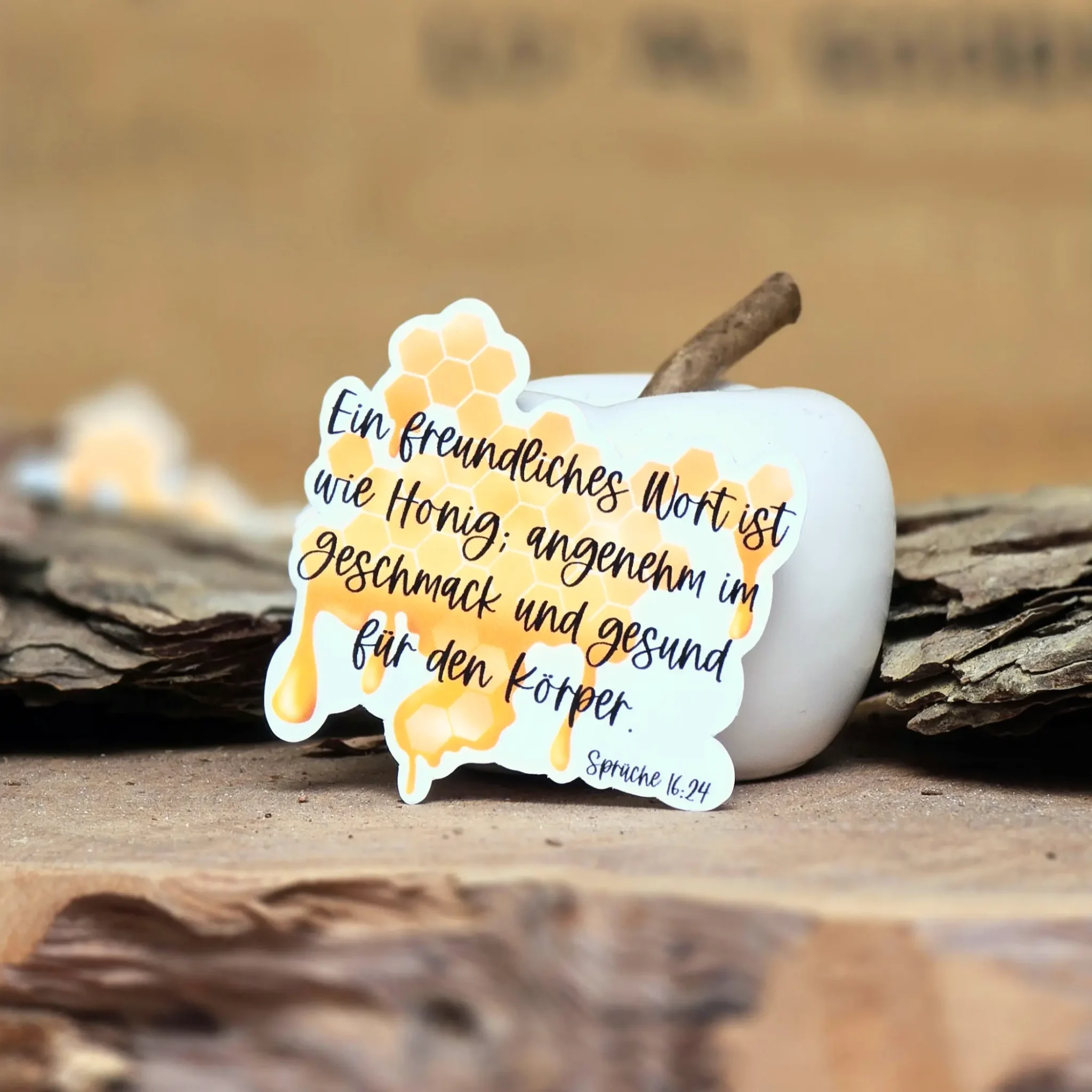 Diese fünf Sticker mit dem Bibelvers aus Sprüche 16:24 sind eine wunderbare Erinnerung für deinen Alltag: „Ein freundliches Wort ist wie Honig; angenehm im Geschmack und gesund für den Körper.“ Das Honigwaben-Design macht sie zu einem besonderen Blickfang.