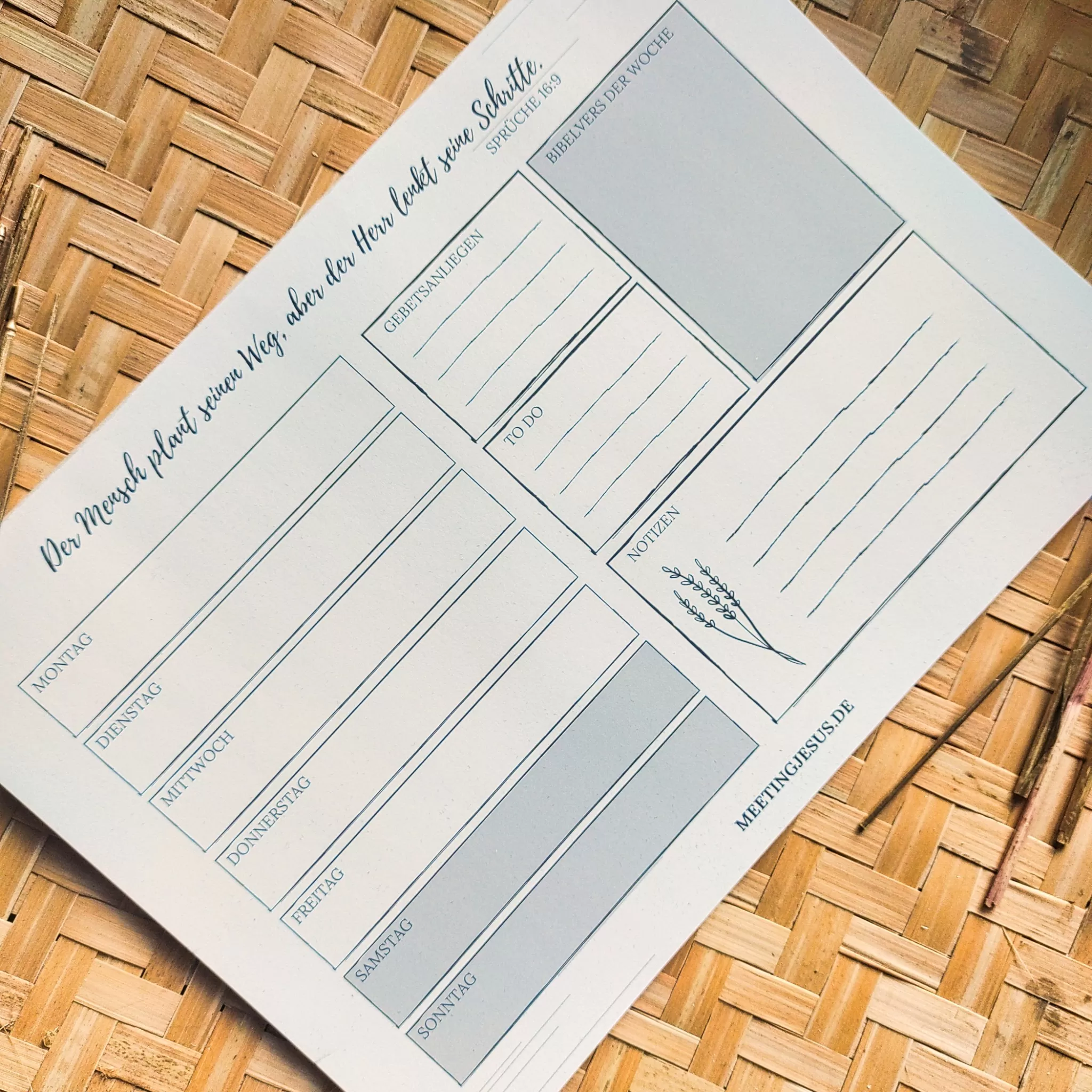 Mit unserem Wochenplaner im A4-Querformat behältst du den Überblick über deine Woche. Auf 50 Blatt findest du ausreichend Platz für Notizen zu jedem Tag, Gebetsanliegen, den Bibelvers der Woche, ToDo’s und weitere wichtige Notizen. Der schlichte und übersichtliche Aufbau hilft dir, deine Woche organisiert und christlich ausgerichtet zu gestalten.