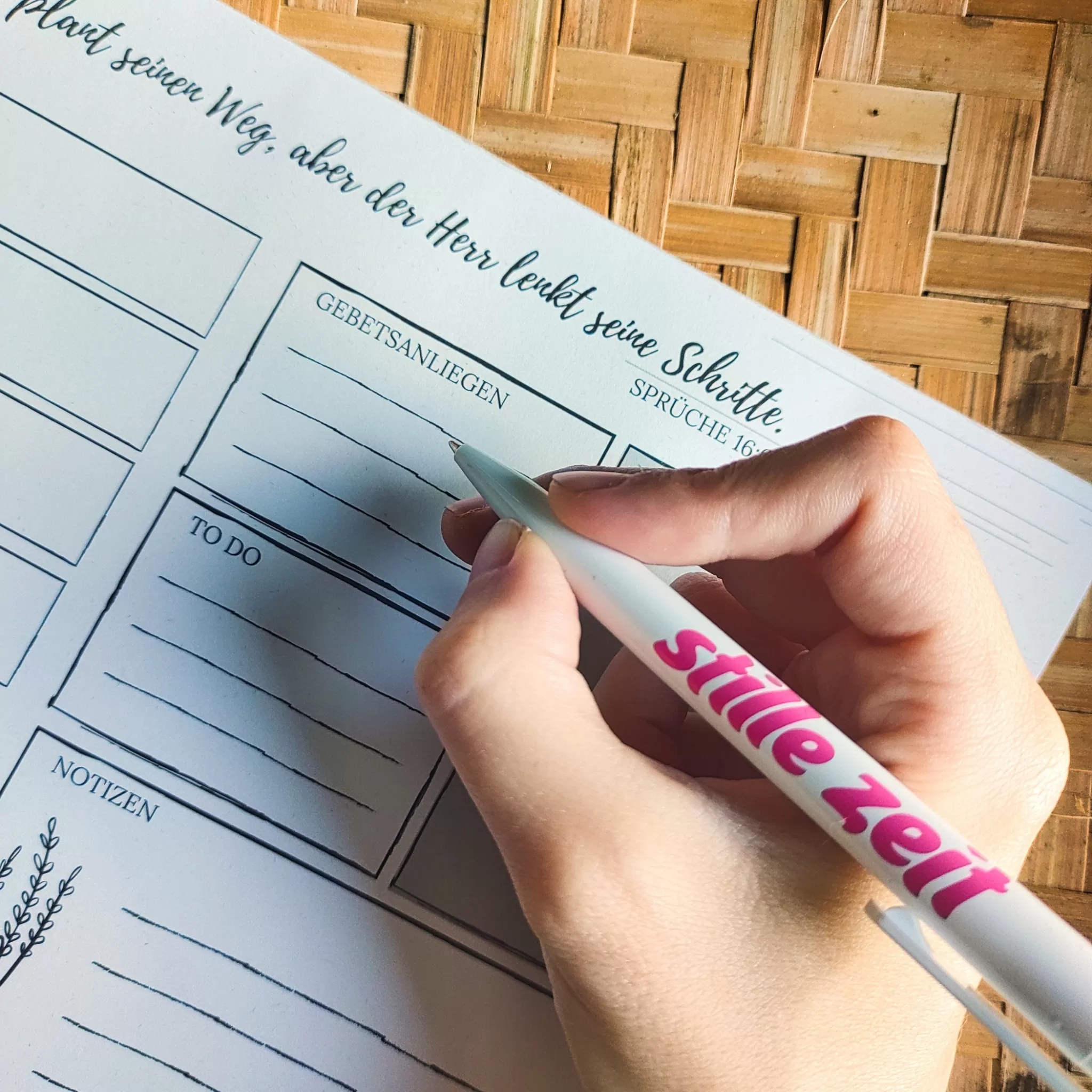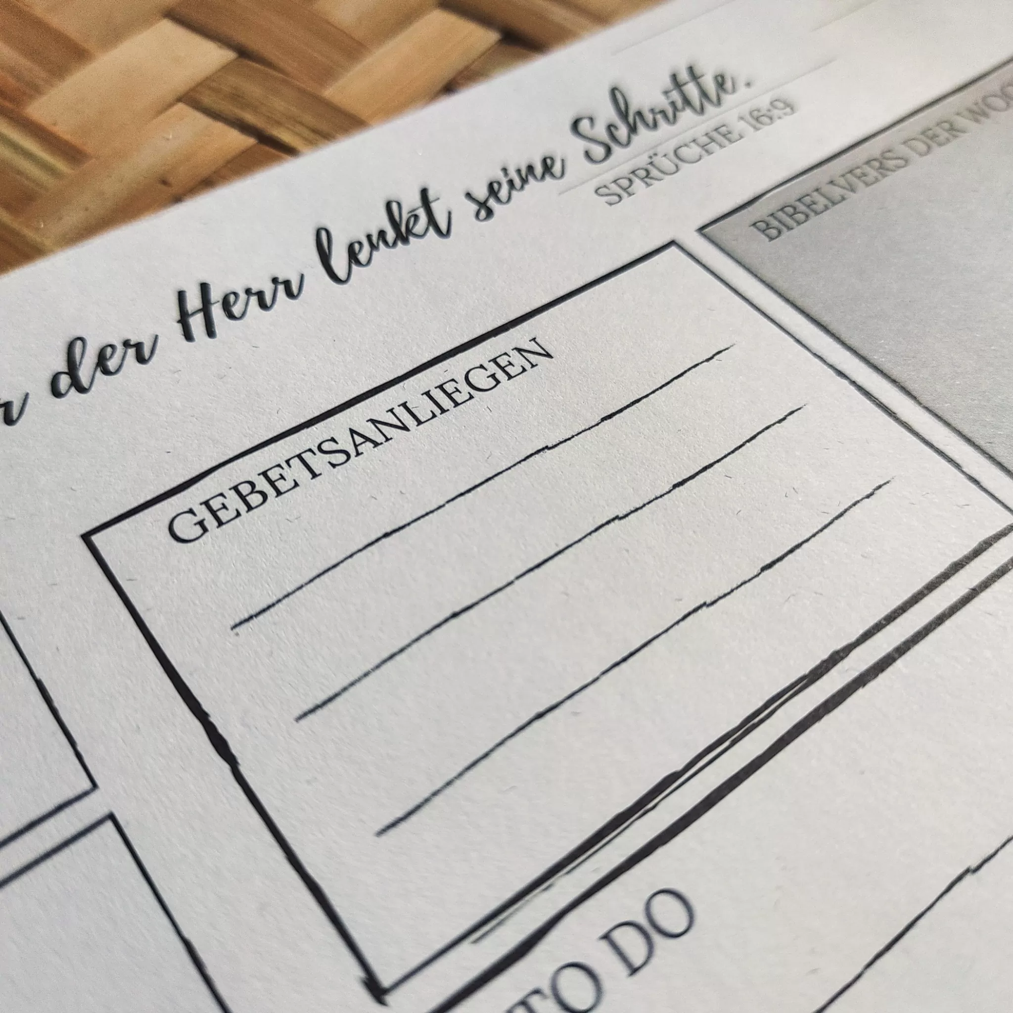 Jede Seite bietet dir die Möglichkeit, deine Gedanken und Gebete festzuhalten, sodass du stets Gottes Wort in deinem Alltag spüren kannst. Unser Motto für diesen Planer lautet: „Der Mensch plant seinen Weg, aber der Herr lenkt seine Schritte.“ (Sprüche 16, 9). Auch wenn mal nicht alles nach Plan läuft, sei dir bewusst, dass Gott dich nicht im Stich lässt.