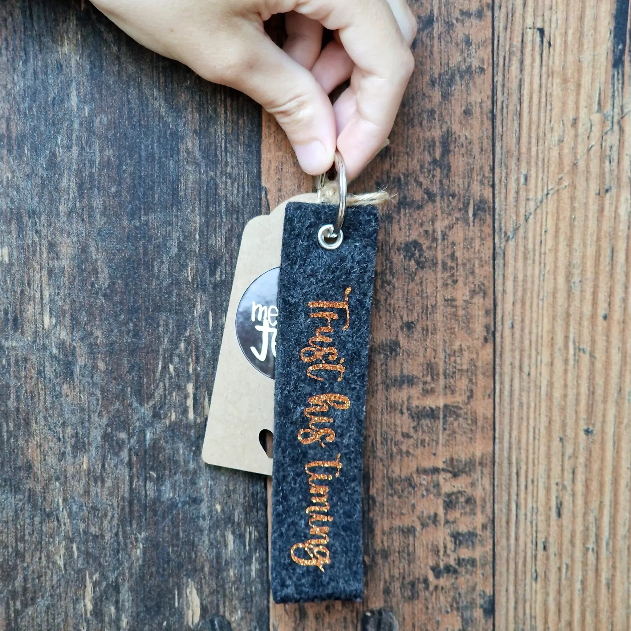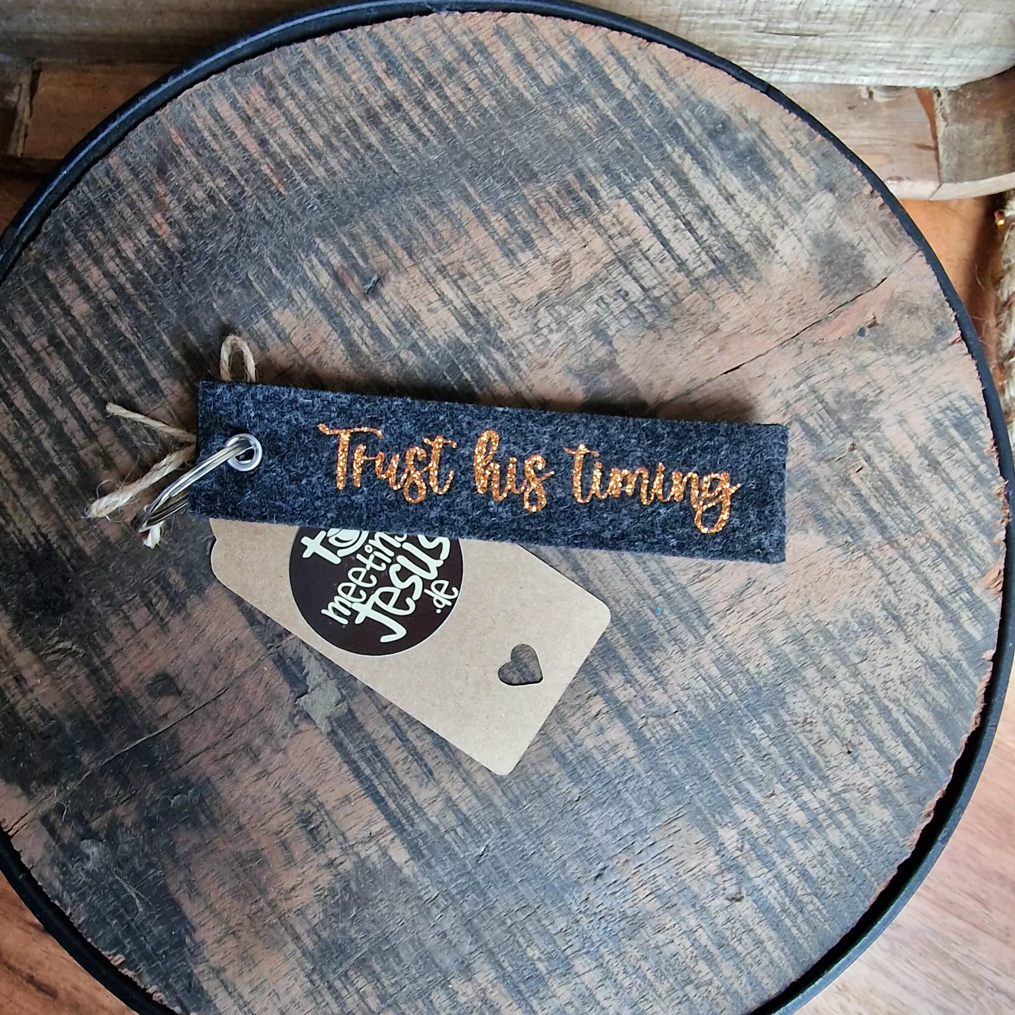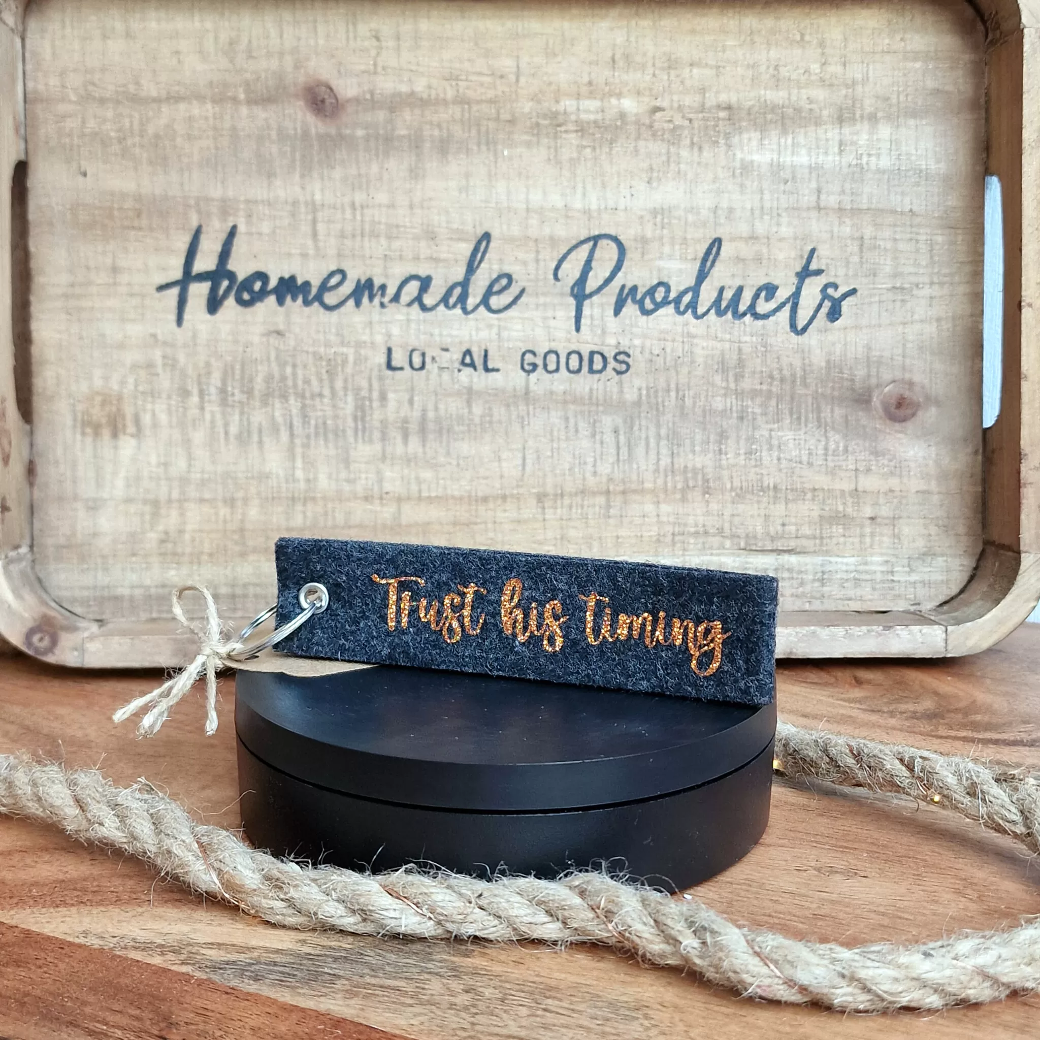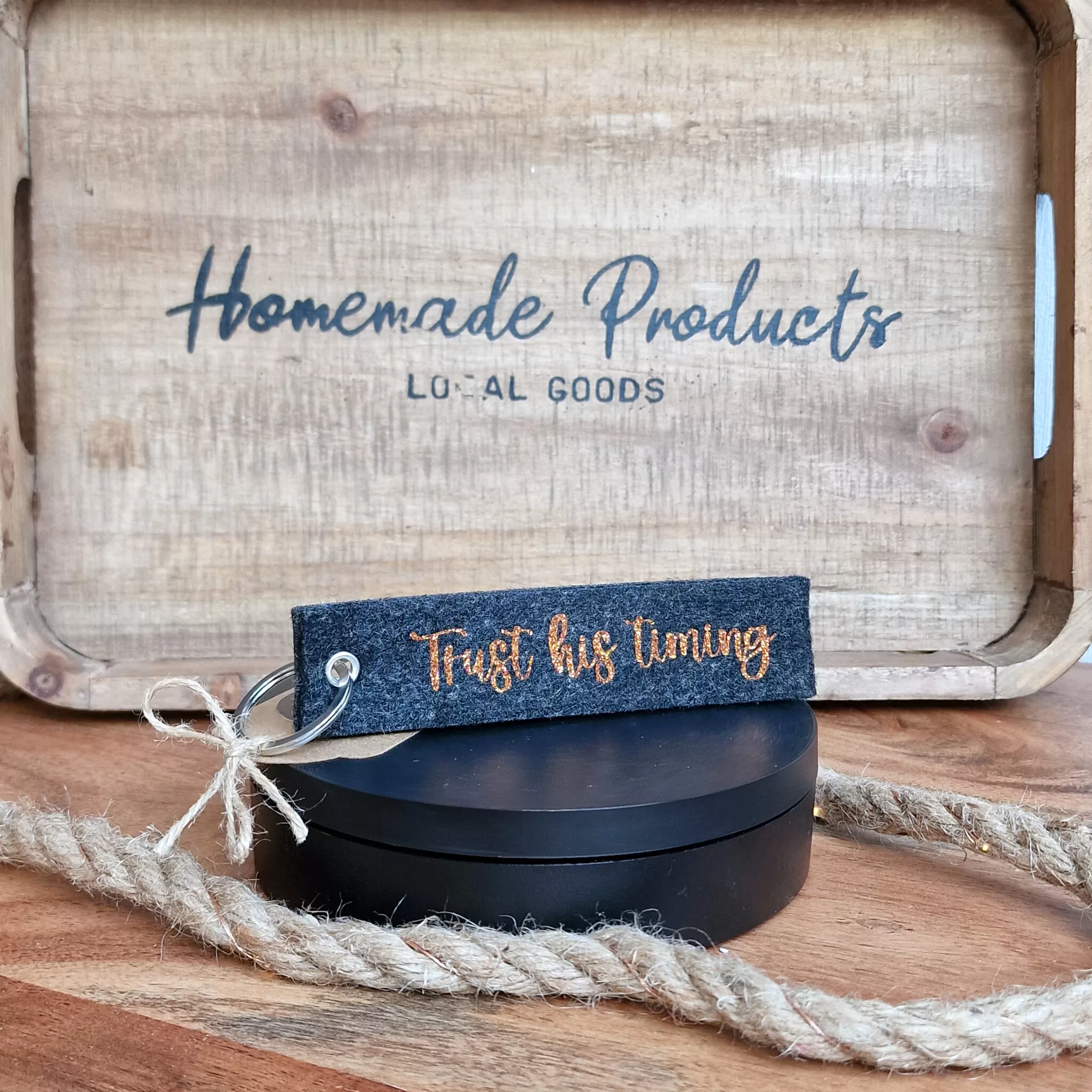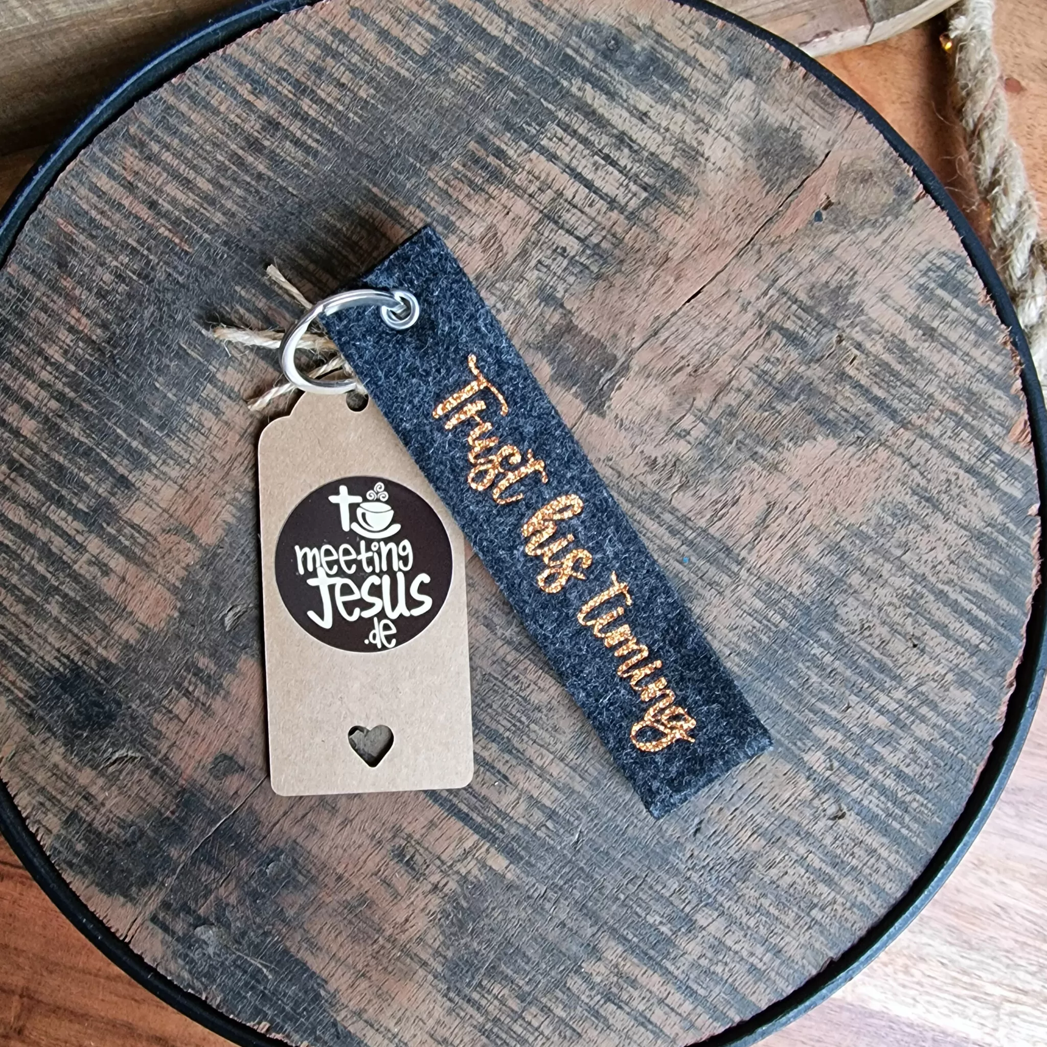 Du bist nicht allein auf deinem Weg des Glaubens, und manchmal brauchst du einfach eine kleine Erinnerung, dass alles im Leben nach Gottes perfektem Timing geschieht. Unser grauer Filz-Schlüsselanhänger mit dem inspirierenden Spruch „trust his timing“ in glänzendem Kupfer-Lettering erinnert dich täglich daran. Jeder Anhänger wird von uns in Handarbeit veredelt, um sicherzustellen, dass er mit Liebe und Sorgfalt hergestellt wird. Hänge ihn an deinen Schlüsselbund, deine Tasche oder deinen Rucksack, und lass dich von diesem kleinen Schmuckstück daran erinnern, dass Gott immer an deiner Seite ist.