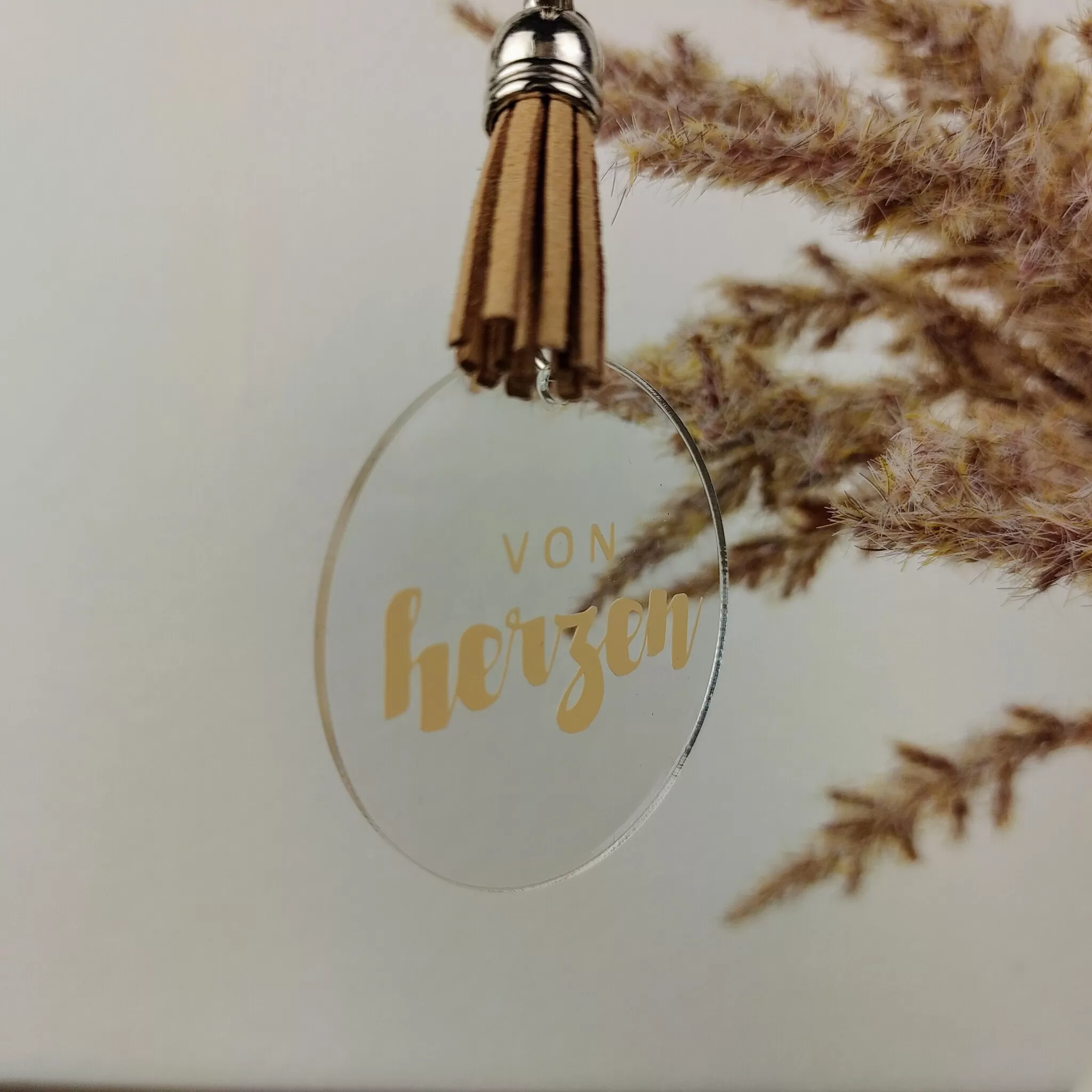Schlüsselanhänger aus Handarbeit. Text aus widerstandsfähigem Vinyl geschnitten.