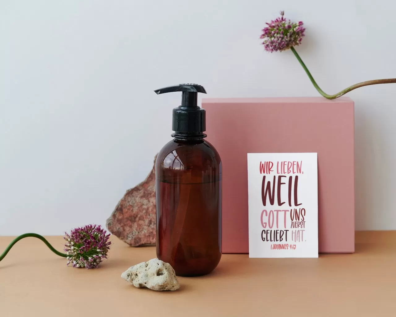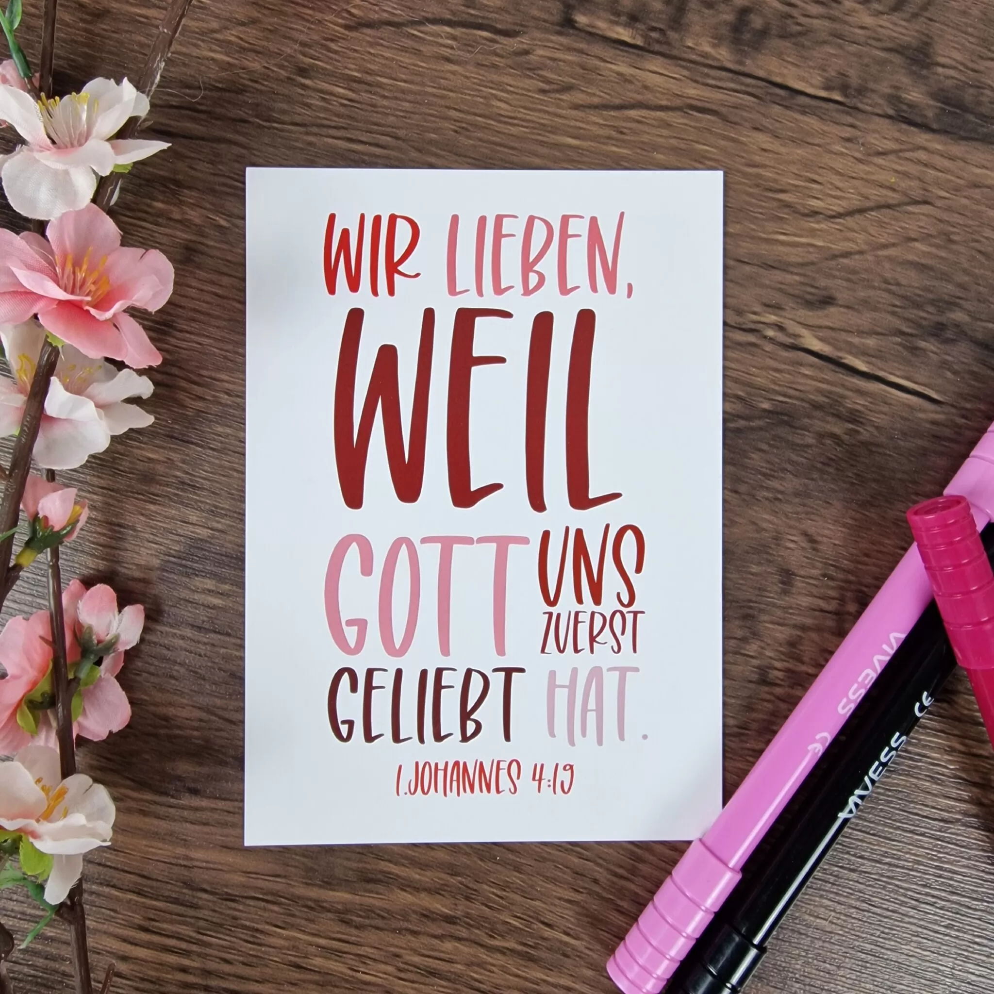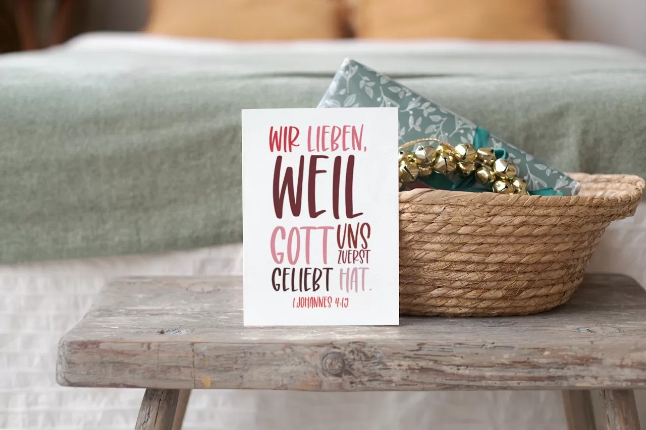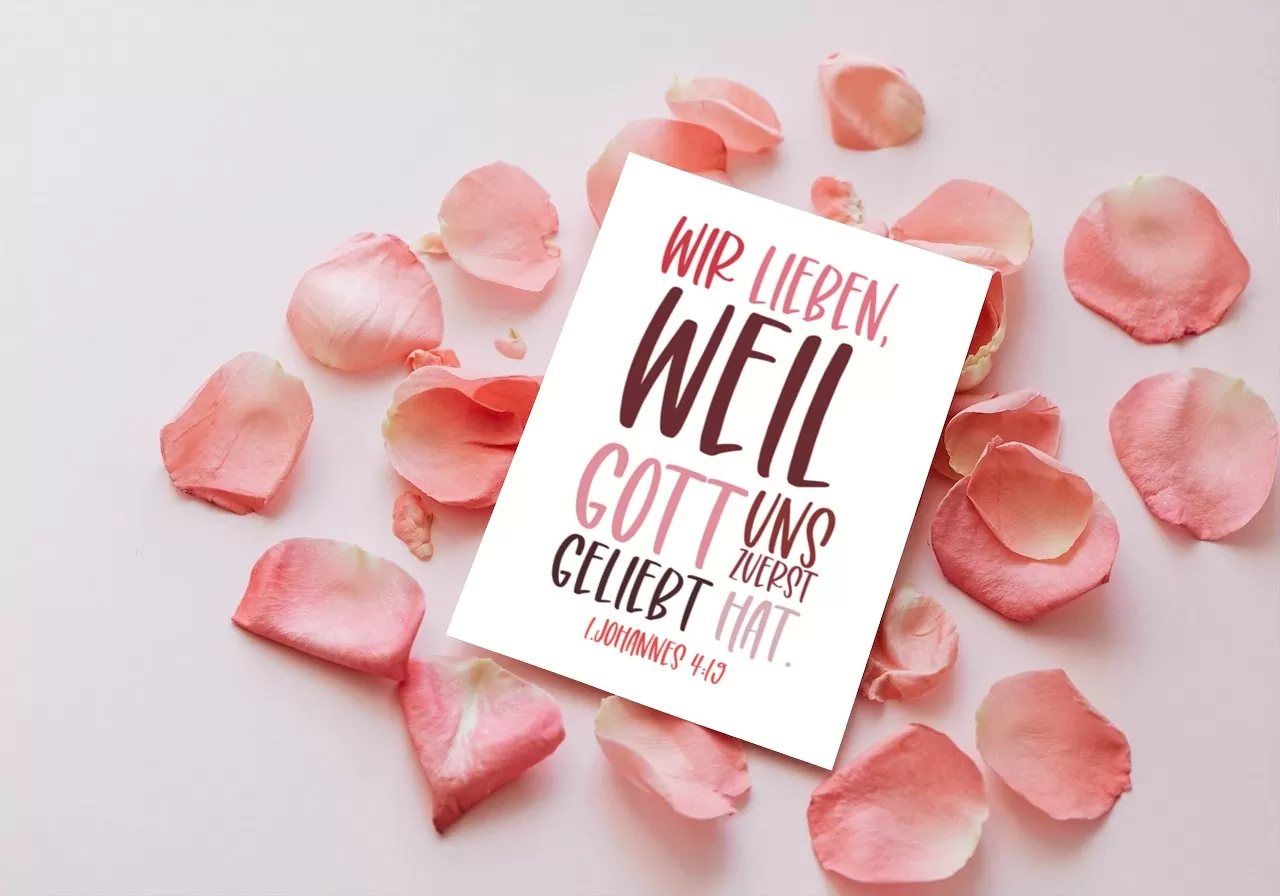 Hey du, hast du schon unsere neue Postkarte gesehen? Es ist ein wunderschöner Erinnerung daran, dass die Liebe, die wir teilen, von Gott kommt. Auf der Postkarte steht die Aufschrift „Wir lieben, weil Gott uns zuerst geliebt hat (1. Johannes 4, 19)“.